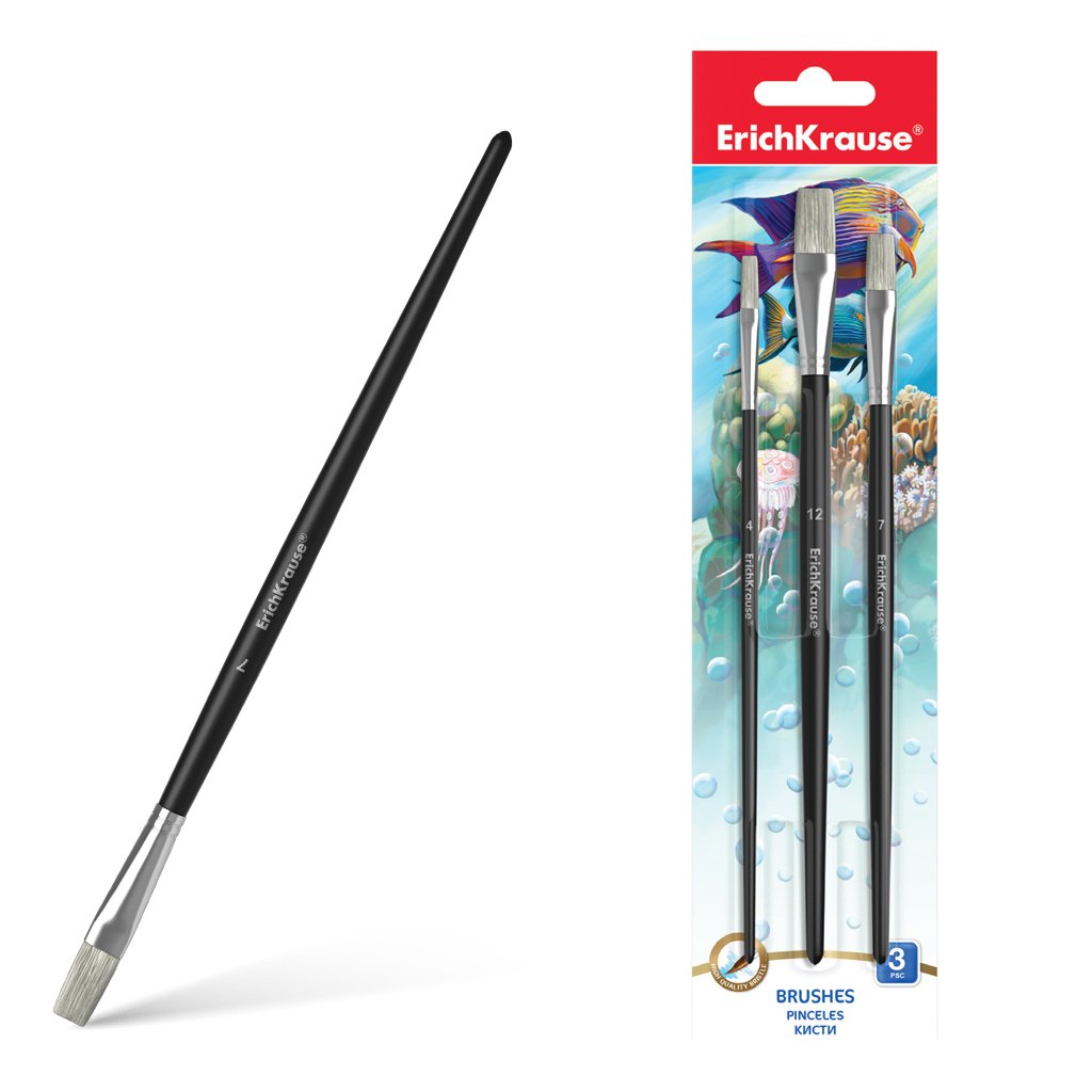 ErichKrause® Brushes work perfectly with most paints, including - acrylic, oil and poster paint. Bristle hair is thick and strong and holds a lot of paint. The brush handle is made of a natural wood and covered with a protective varnish. Seamless aluminum ferrules are rust proof and will not allow solvent to affect the brush head. Set contains: flat- 4, 7, 12.