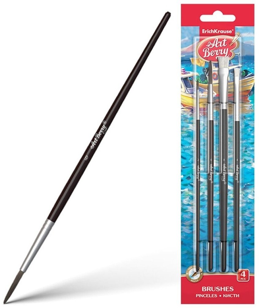 Πινέλα ArtBerry® για σχέδιο με ακουαρέλες και γκουάς. Το τμήμα εργασίας της βούρτσας καλύπτεται με κόμμι, που το προστατεύει κατά την αποθήκευση και τη μεταφορά. Η λαβή είναι κατασκευασμένη από φυσικό ξύλο και καλύπτεται με προστατευτικό βερνίκι. Ο πλήρης μεταλλικός δακτύλιος χωρίς ραφή από αλουμίνιο είναι ανθεκτικός στη διάβρωση. Το σετ περιέχει: στρογγυλό (πόνι)-2, 6 και πλακέ (τρίχα)- 4, 8.