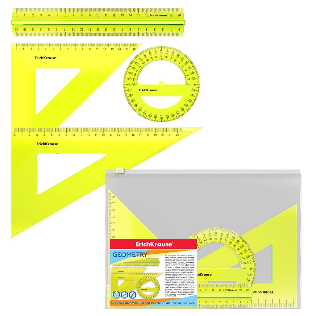 Σετ ημιδιαφανούς γεωμετρίας από πλαστικό υψηλής ποιότητας. Το σετ περιλαμβάνει 4 είδη: χάρακα με βάση 20cm, σετ τετράγωνο 16cm/45°, σετ τετράγωνο 22cm/60°, μοιρογνωμόνιο 360°/12cm.