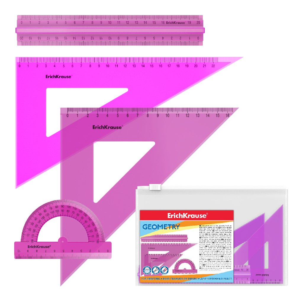 Σετ ημιδιαφανούς γεωμετρίας από πλαστικό υψηλής ποιότητας. Το σετ περιλαμβάνει 4 είδη: χάρακα με θήκη 20cm, σετ τετράγωνο 16cm/45°, σετ τετράγωνο 22cm/60°, μοιρογνωμόνιο 180°/10cm.