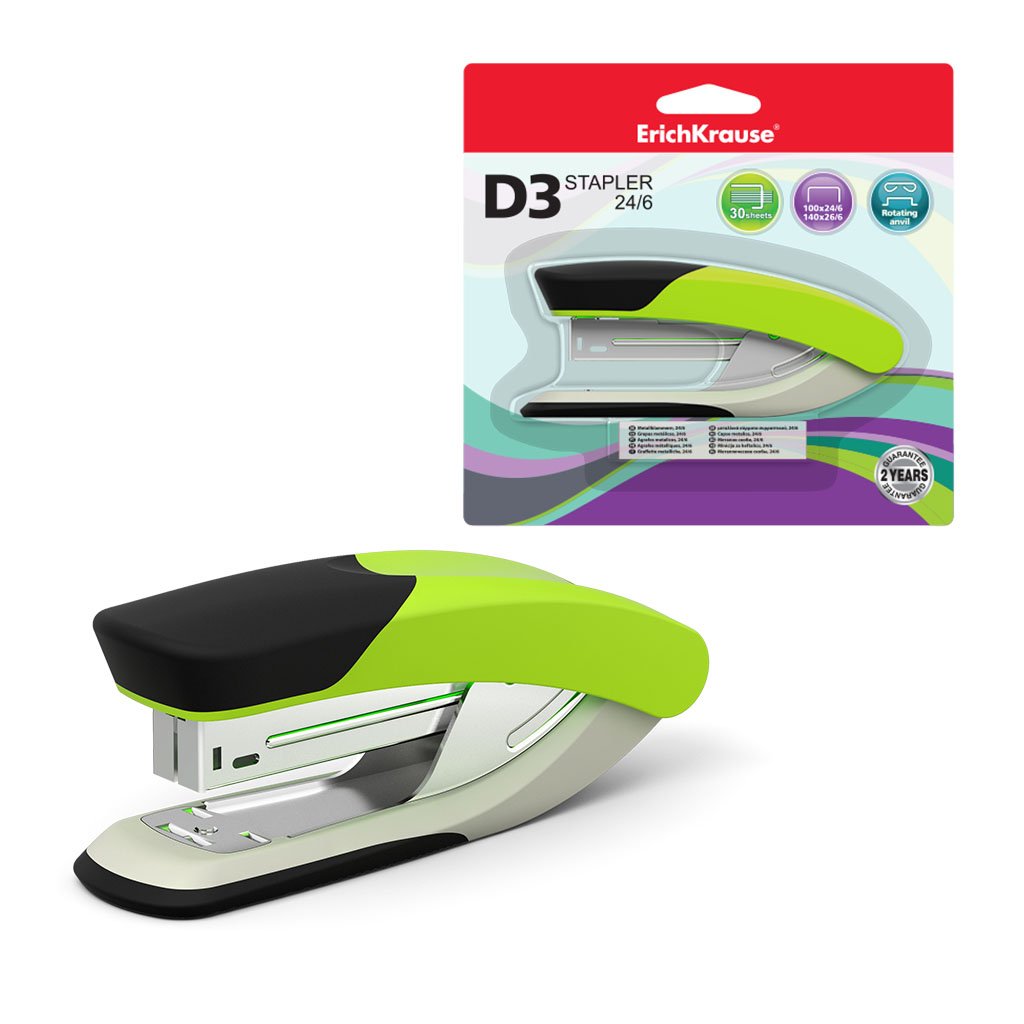 Συρραπτικό κατασκευασμένο από ανθεκτικό στην κρούση πλαστικό εξοπλισμένο με μηχανισμό χάλυβα υψηλής ποιότητας. Διαθέτει δύο τύπους συρραφής: προσωρινό και μόνιμο. Εξοπλισμένο με ελαστικό αντιολισθητικό ένθετο. Χωρητικότητα 100 συνδετήρες №24/6 και 140 συνδετήρες №26/6. Συνδέει έως και 30 φύλλα. Βάθος εισαγωγής χαρτιού 40mm. Παρέχεται με συνδετήρες №24/6 σετ. Μηχανισμός 2 χρόνια εγγύηση όταν χρησιμοποιείτε συνδετήρες ErichKrause®.